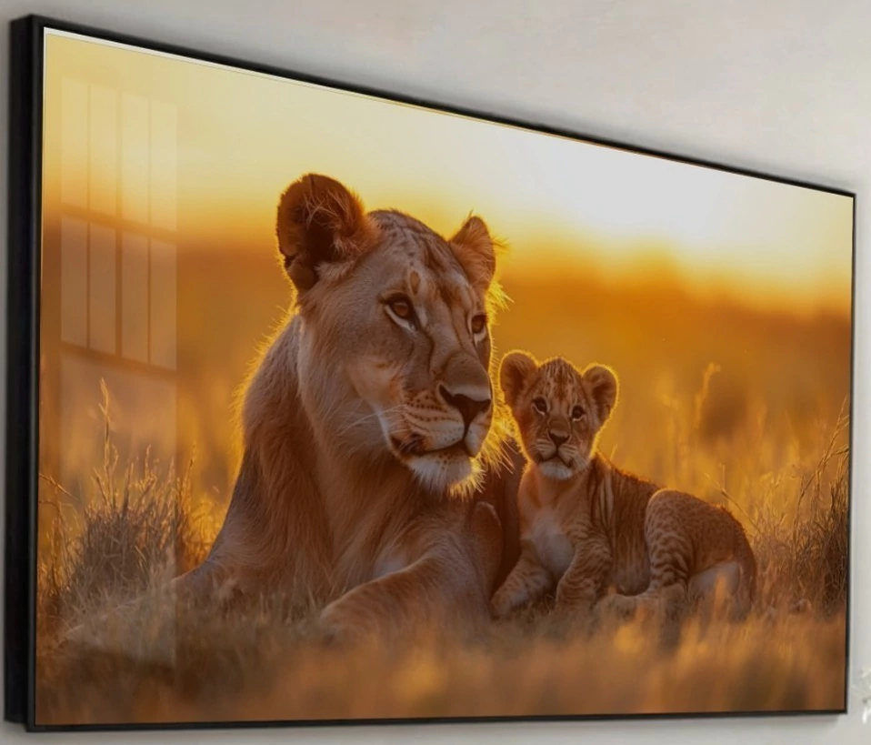 O quadro Leoa ao Entardecer captura um momento íntimo entre mãe e filhote, banhados pela luz dourada do pôr do sol africano.