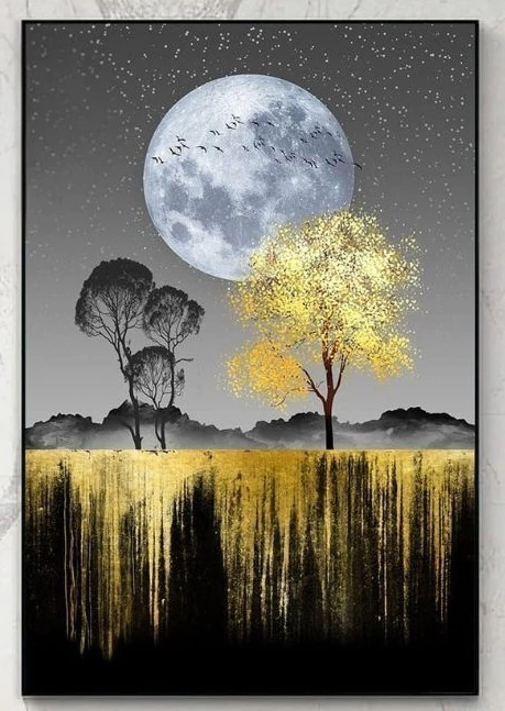 Esta obra combina o brilho da árvore dourada com a imponência da lua cheia, criando uma cena mágica e fora do comum.